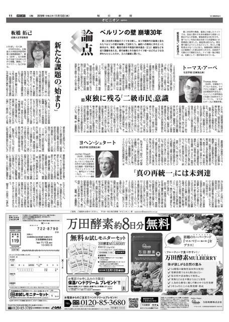 Essay in Mainichi Shimbun (Tokio) vom 13. November 2019 zu den Auswirkungen der deutschen Vereinigung auf die Europäische Integration und das Alltagsleben der Ostdeutschen.